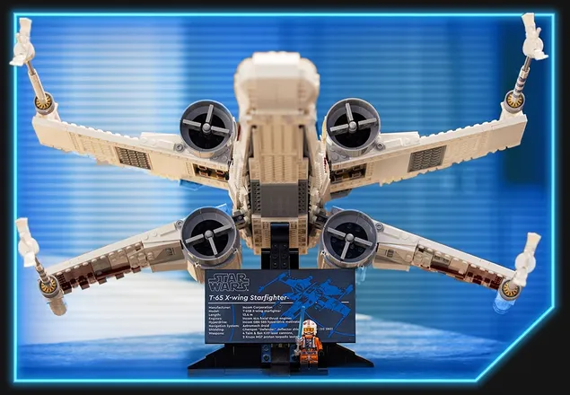 Le X-Wing mesure plus de 55 cm de long et inclut un socle à construire doté d’une plaque avec des données techniques sur le X-Wing et d’un espace pour la minifigurine LEGO de Luke Skywalker (nouvelle version de mai 2023) avec son sabre laser.